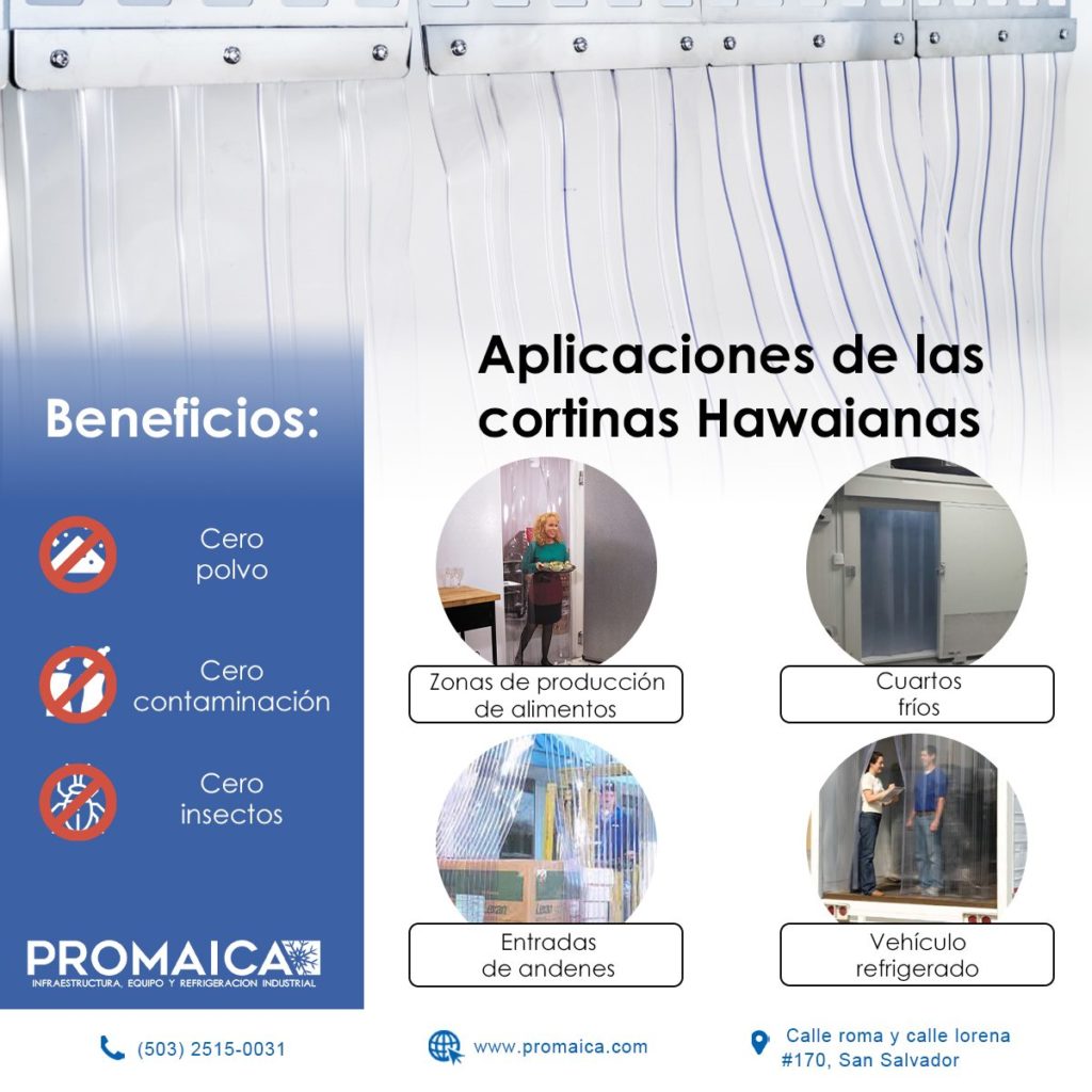 Puedes reforzar tu cuarto frío instalando cortinas hawaianas o de lama que ayudarán a crear una barrera que impida el paso de aire cálido, polvo e insectos. Por lo tanto, cumple doble función porque evita el paso de agentes contaminantes y la pérdida de cualidades térmicas, cumpliendo así los requerimientos sanitarios al no dejar que los productos pierdan sus propiedades por mal congelamiento o generación de virus y bacterias.
